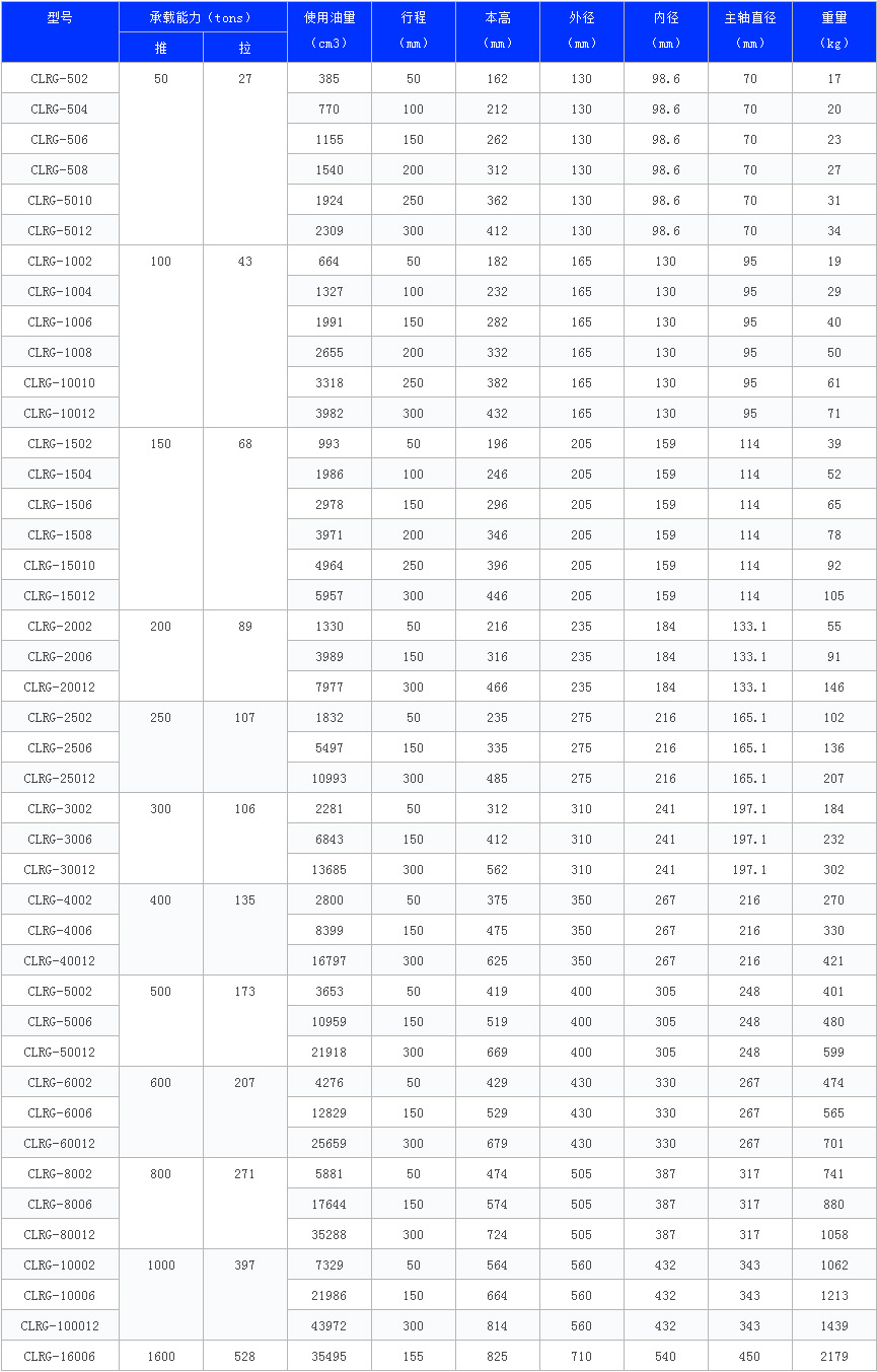 大噸位油缸(雙作用) ◆ CLRG系列均具底座螺孔; ◆ 雙動推、拉液壓回縮; ◆ 主軸硬鉻處理,耐磨、抗腐蝕; ◆ 油壓缸的回油油路具回油安全閥裝置預(yù)防突然超壓損壞,上腔安全閥