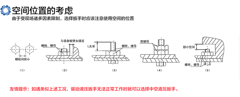 由于受現(xiàn)場(chǎng)諸多因素限制,選擇液壓扳手是應(yīng)注意使用空間的位置