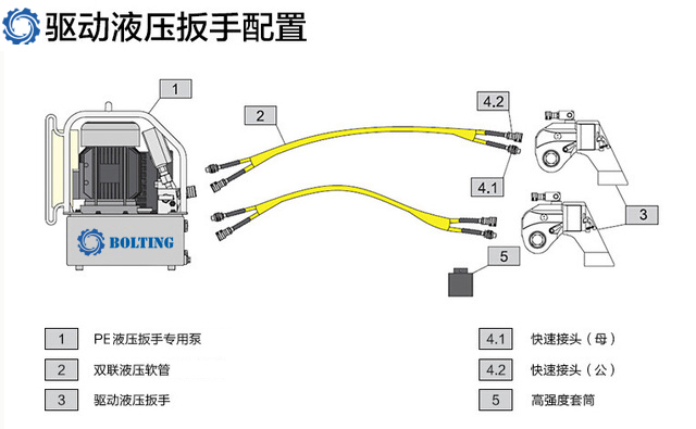 液壓扳手專用泵是液壓扳手的動力單元.。液壓扳手專用泵屬于高壓泵,最高工作壓力一般為70MPa,常見的有電動液壓泵和氣動液壓泵。如下液壓扳手配置圖: